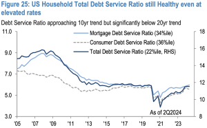 One key indicator, the household debt service ratio—which measures the percentage of total debt payments to total disposable income—shows that consumers are managing their financial obligations effectively. This reflects a healthy balance between income levels and debt payments, supporting continued consumer spending, a critical engine of economic growth (chart from JP Morgan):