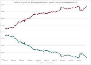 U.S. consumer spending habits have shifted dramatically over the decades. In the 1970s, spending was evenly split between goods and services. Today, consumers spend roughly twice as much on services as on goods.
