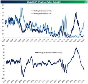 Even if the Fed refrains from further rate cuts in 2025, global central banks have been actively easing monetary policy throughout the year. This collective effort to lower rates should provide a supportive backdrop for the global economy (chart from Bespoke):