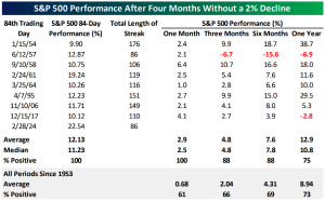 - Contrary to popular belief, a lack of correction in the stock market is not necessarily a bearish signal. It’s been four months since the S&P 500 had a 2% decline. That’s incredibly rare, with only 8 occurrences since 1953. In 7 out of 8 instances, the market was higher six months later, with an average gain of almost 8%. While this trend cannot continue indefinitely, it is encouraging to see that similar periods of strength were not followed by a bear market over the next year (table from Bespoke Investment Group):