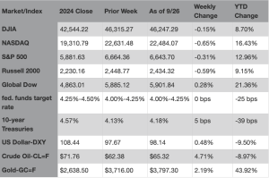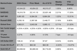 The stock market continued its record-setting run last week with the Dow, the S&P 500, and the NASDAQ each reaching new record highs. The small caps of the Russell 2000 also hit a new high for the first time in four years, which signaled a broadening of the rally beyond tech stocks. The major impetus for last week’s market performance was the Federal Reserve’s decision to trim interest rates (see below) for the first time this year. In addition, the Fed projects that more rate cuts are possible before the end of this year, which investors view as a positive for economic growth and corporate earnings. While inflation appears to have moderated somewhat, the Fed’s challenge is to support a cooling job market without reigniting inflationary pressures. The interest rate cut also influenced the bond market, with 10-year Treasury yields ticking higher as bond prices declined. Crude oil prices fell on concerns about waning global demand, abundant supplies, and implications from the aforementioned interest rate cut.