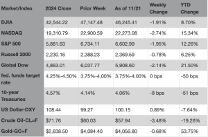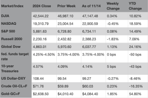Last week was marked by the re-opening of the U.S. government after a prolonged shutdown. However, despite a significant boost to the stock market at the beginning of the week, the positive momentum waned as the week progressed as investors were concerned about high valuation of AI stocks and uncertainty over Federal Reserve policy. The NASDAQ and the Russell 2000 ended the week in the red, while the S&P 500, the Dow, and the Global Dow closed higher. The AI sector, which has been a major market mover for much of the year, experienced significant volatility as investors worried about long-term sustainability. Health care, energy, and materials were market sector gainers, while consumer discretionary and communication services underperformed. Ten-year Treasury yields rose, likely reflecting reduced expectations for another interest rate cut at the next Federal Reserve meeting in December. Crude oil prices moved very little from the prior week as ongoing concerns surrounding increasing U.S. inventories and overproduction weighed on prices.