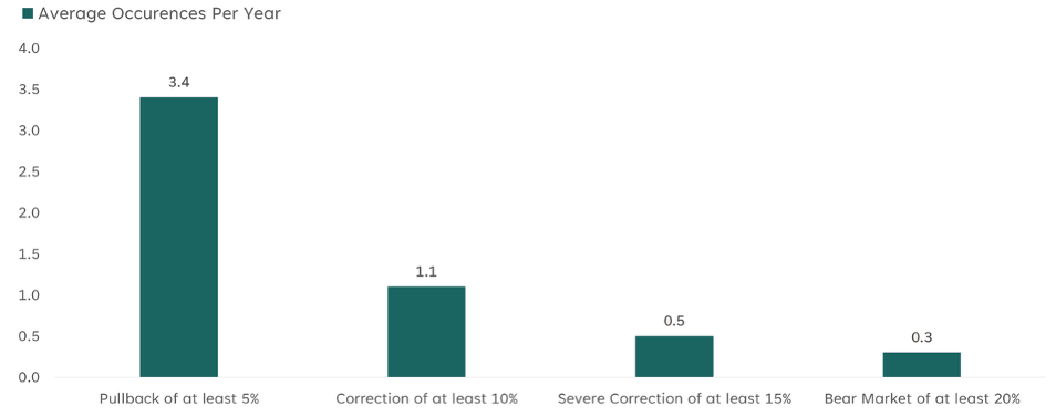 While improving breadth and more diversified leadership are constructive developments for forward returns, pullbacks of 5-10% are still a regular feature of equity markets. On average, the market experiences roughly three declines of at least 5% each year and one decline of 10% or more.