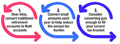Roth conversions are taxable events, but they may help reduce RMDs later. How they work:
